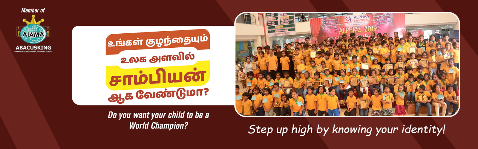 Alphaa Kids World a prestigious ISO 9001:2015 Institution in Erode Tamilnadu was set up by Mr.Gokulakrishnan Shanmuganathan in the year 2003,and is Member of AIAMA-Abacusking International Abacus & Mental Arithmetic TAIWAN and also associated with Chinese Abacus Association The tie-up with them provides an international platform for our students to compete and show their talents on a global level.
